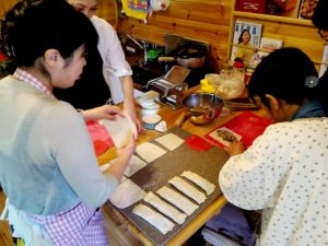 今回の生地は熱湯でこね、寝かしてから麺マシーンで1ミリの厚さにのばしてカットします