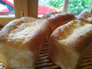 家で焼いてきたライ麦の大ーきいパンをスライスしてトースト(サーモンソテーじゃないよ)