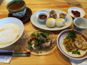 よだれ鶏、鶏スープのお粥、トッピングは腐乳・油条・ザーサイ