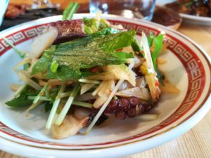 父の1本釣りによる明石タコ! のサラダ豆板醤ソース